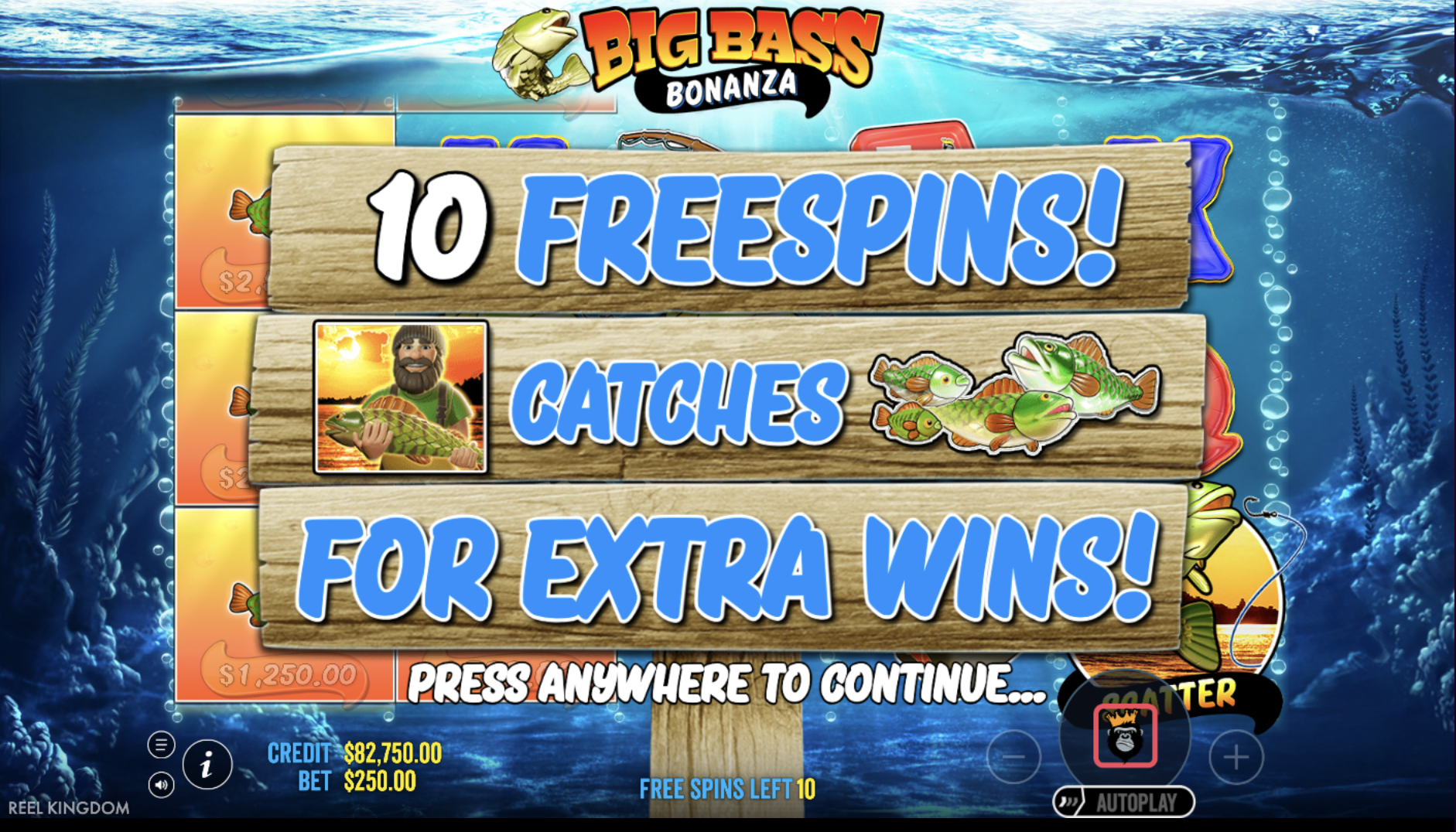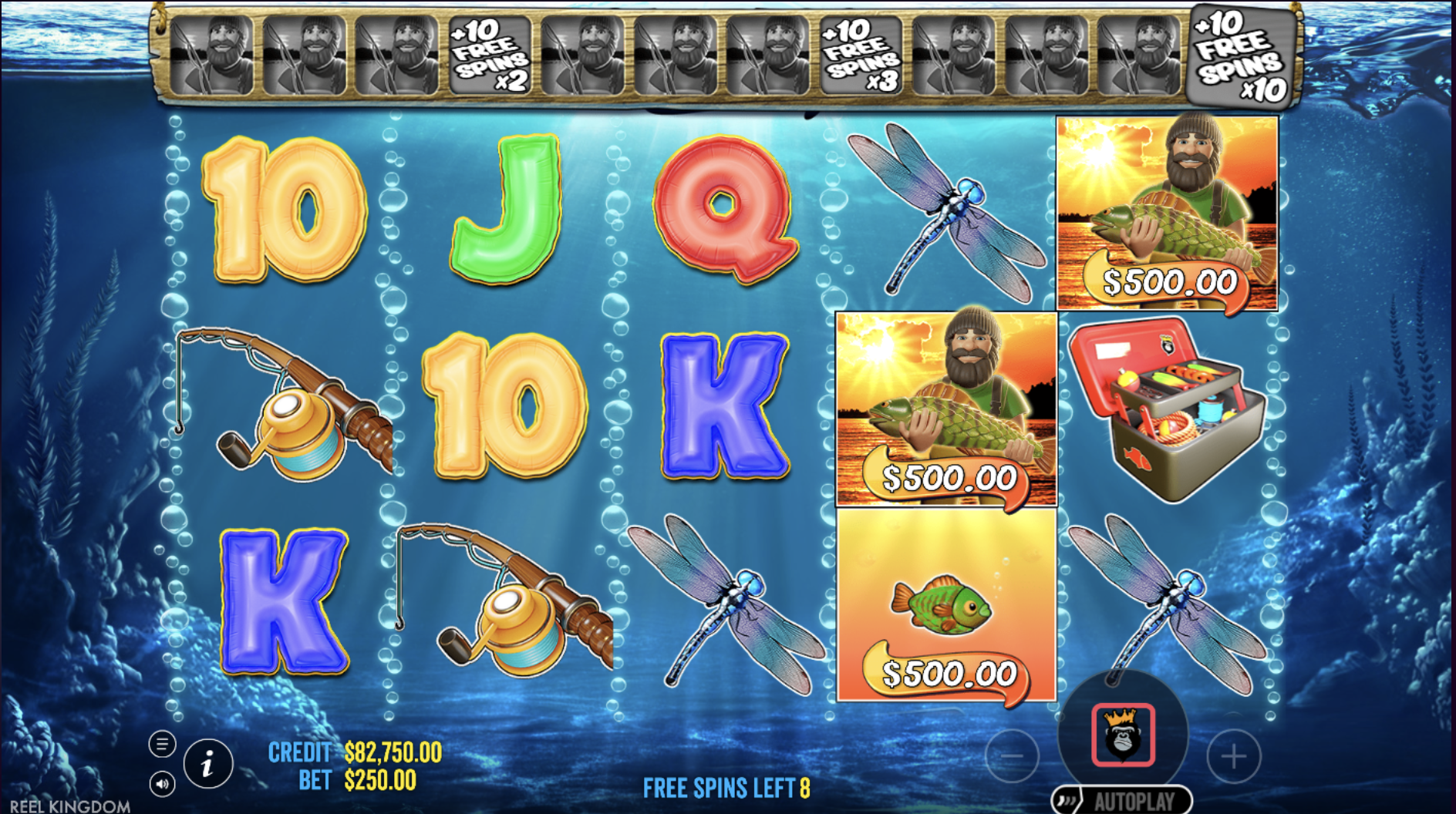 During the free spins bonus, special fisherman wilds appear and collect the values from fish symbols on the reels. As more wilds land, the potential for larger wins increases, making the bonus round the main highlight of the game.